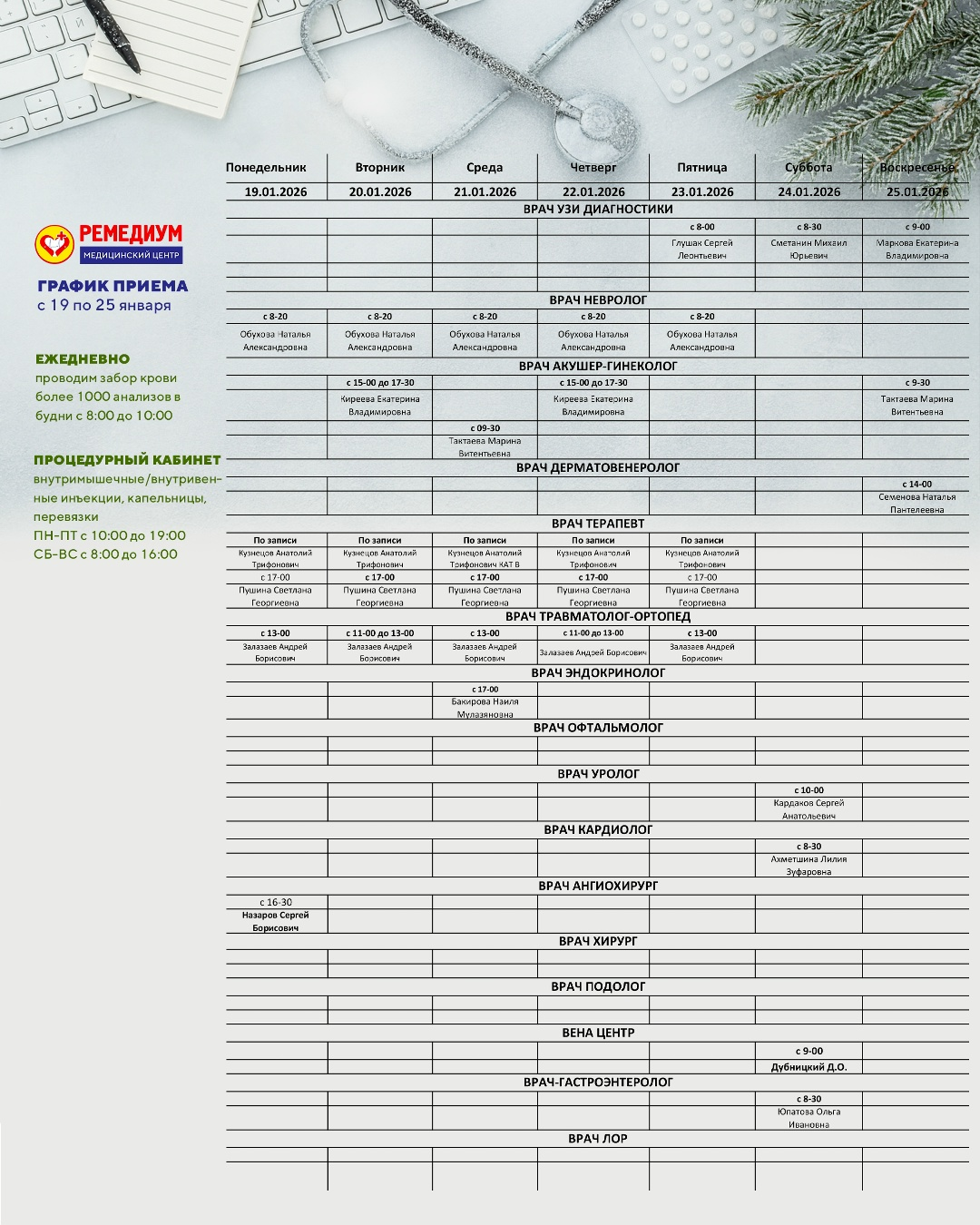 График приема специалистов с 19 по 25 января